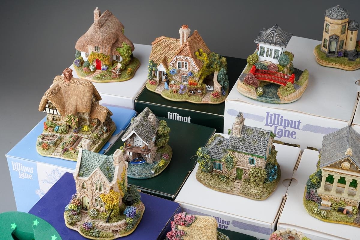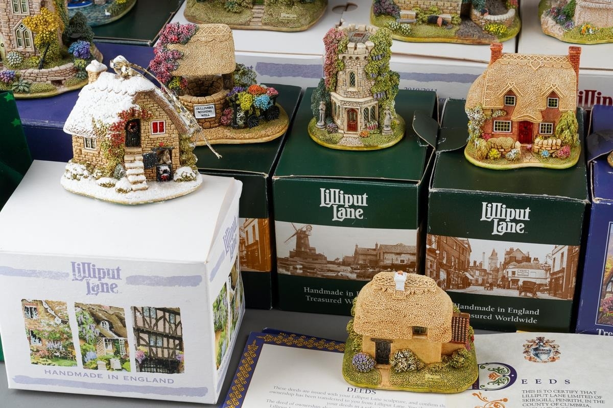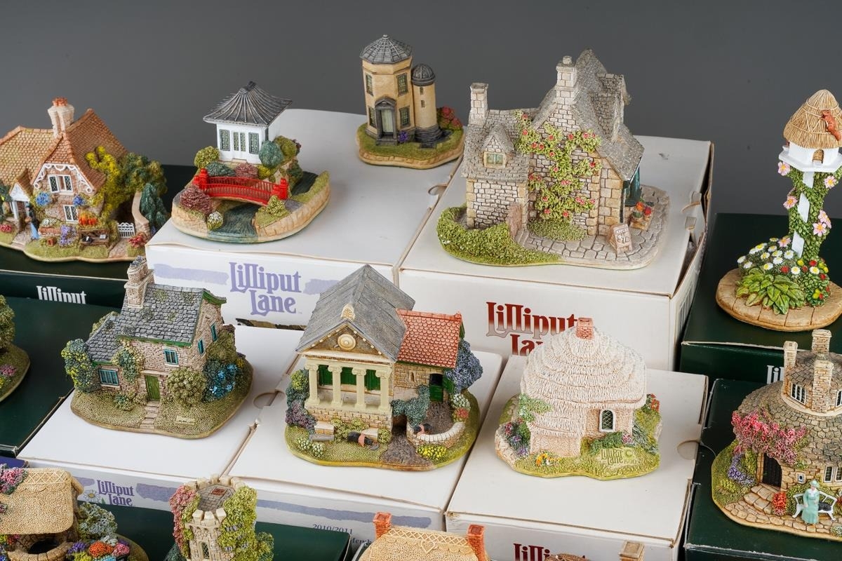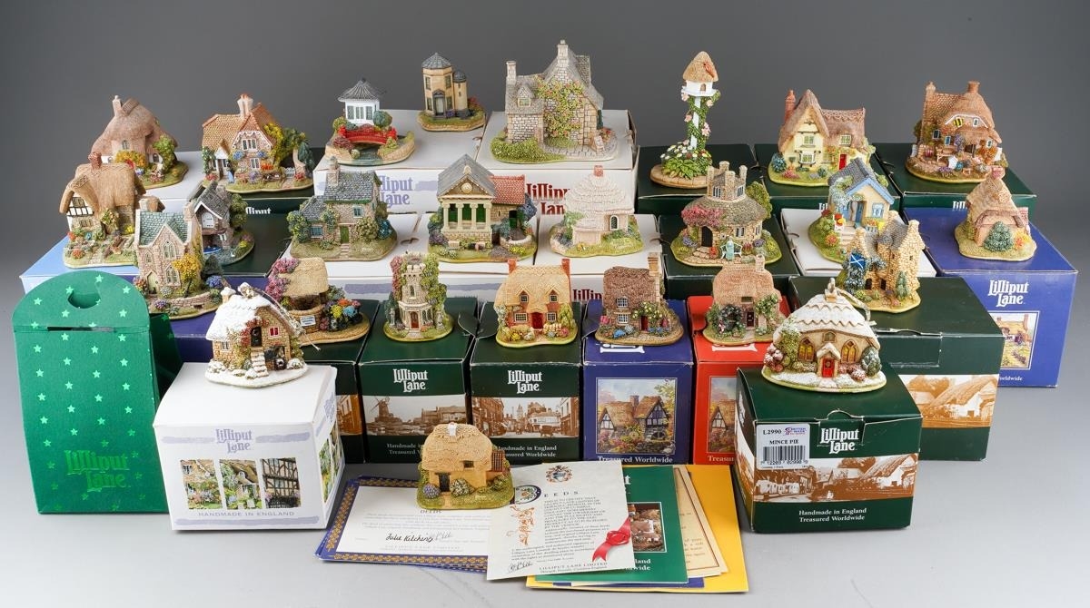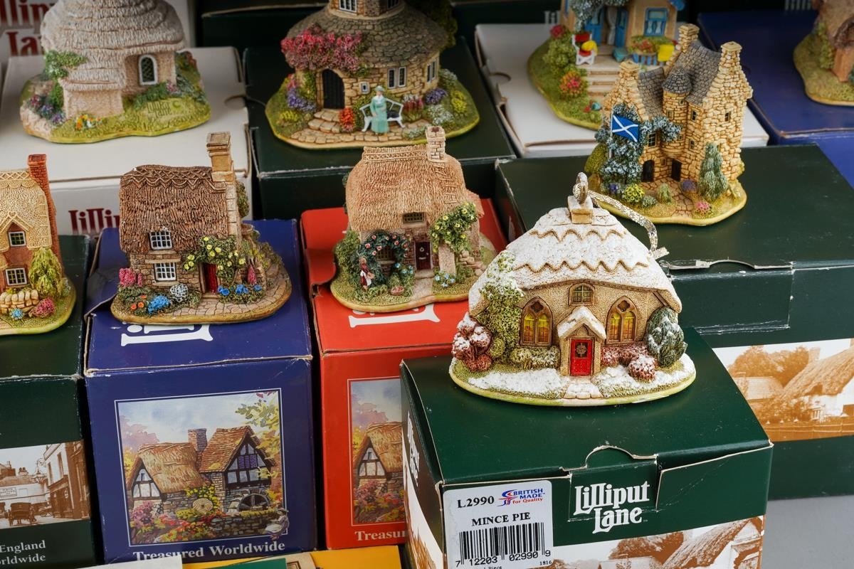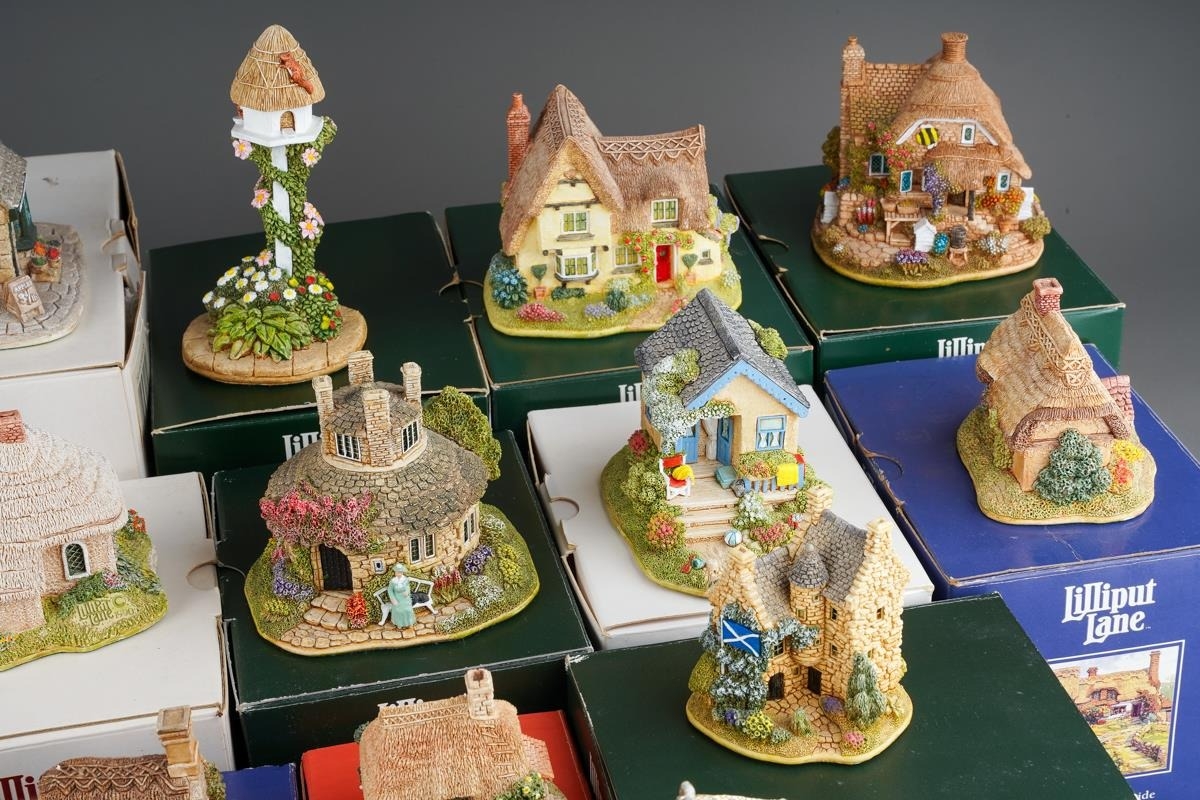 Twenty six small Lilliput Lane models, the majority boxed, comprising two Christmas baubles The Donkey stable and Mince Pie, Rose Bouquet, Nightingale, Juliet's Tower, The Perfect Mum, Just For You, Gulliver's Wishing Well, Wash Day, Hubble Bubble, The Pig Sty, Home From home, Robins Gate, Ullswater Boat house, Golden Days, Cabbage patch Corner, Scotland The Brave, Nutkin cottage, Honeysuckle Dovecot, Little Bee, Mother's Joy, Afternoon Tea, Home Is Where The Heart Is, Village Shop - The Greengrocers, Tower Of the Winds and The Chinese House, generally in good condition overall (2 boxes)