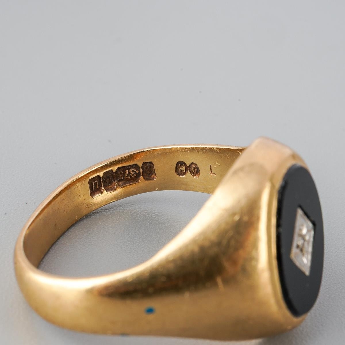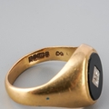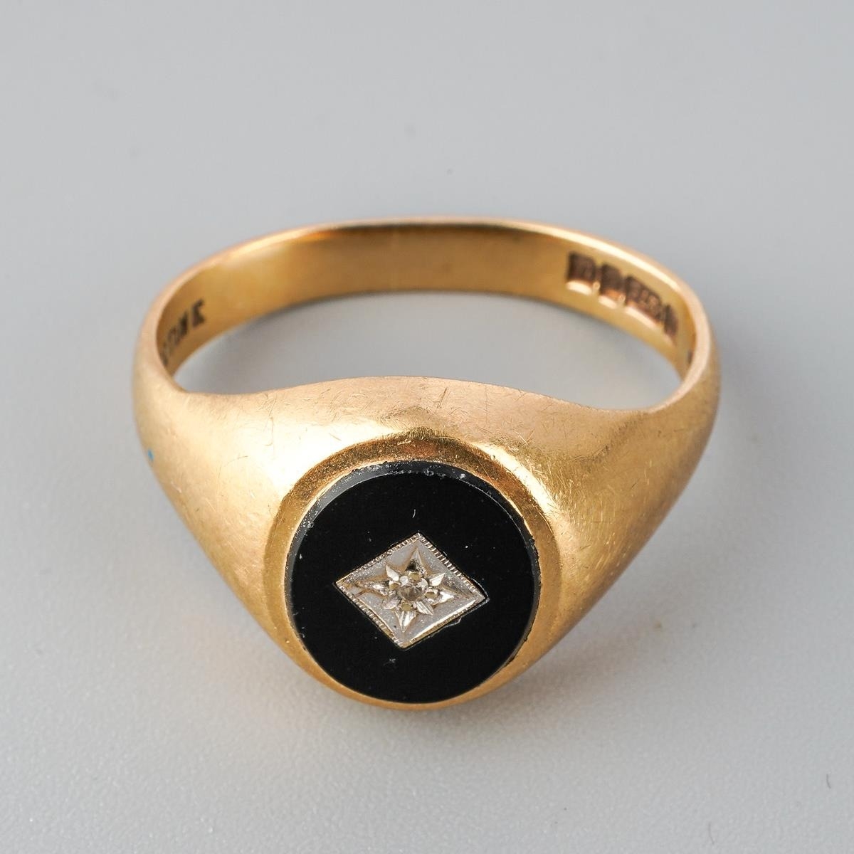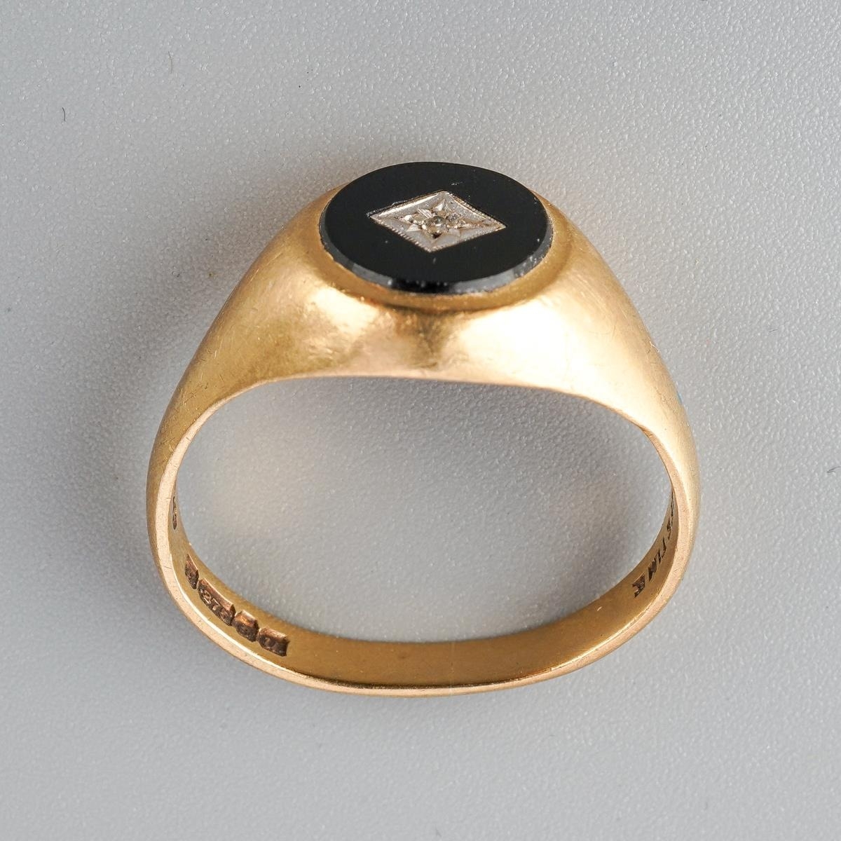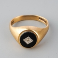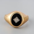 9ct gold and onyx men's ring set with inclusion set diamond to centre, UK size S ( slightly misshapen), gross weight approx. 5.4g