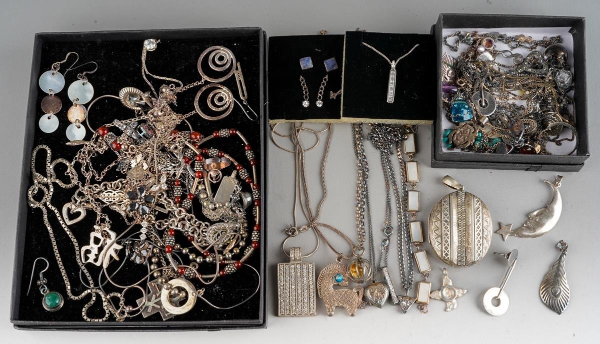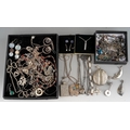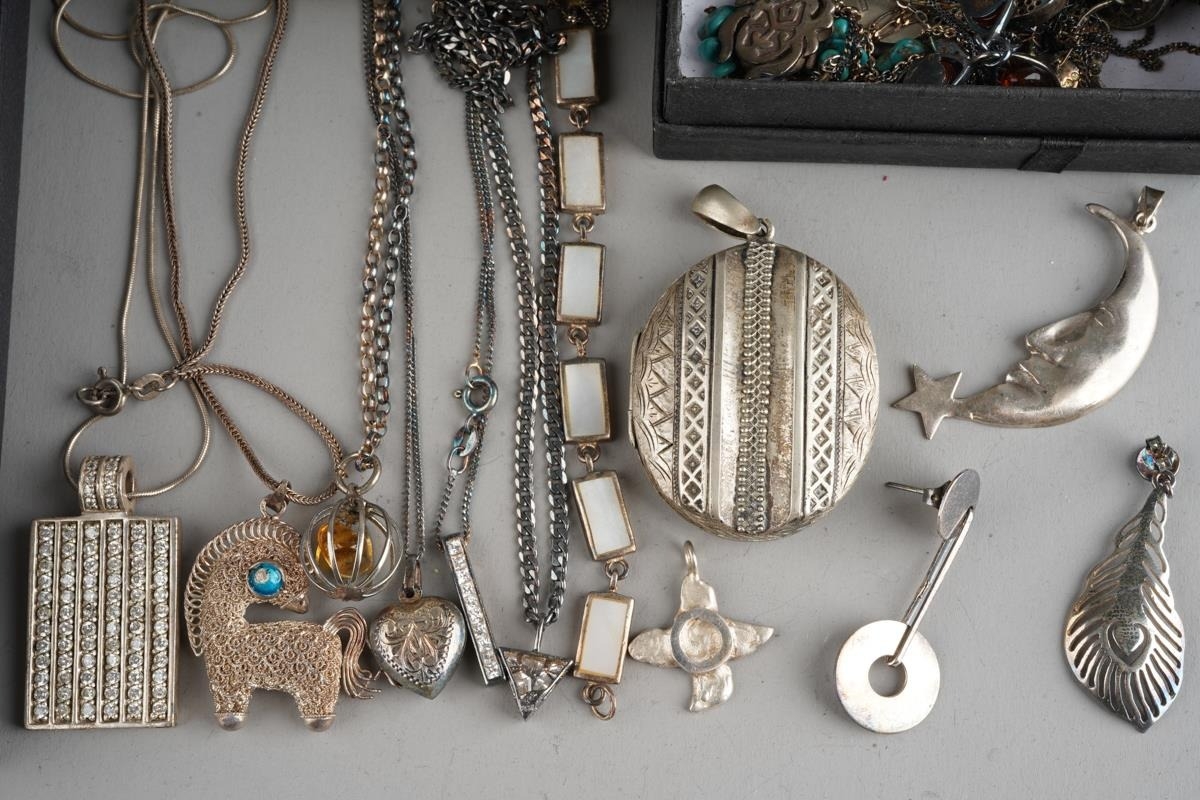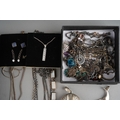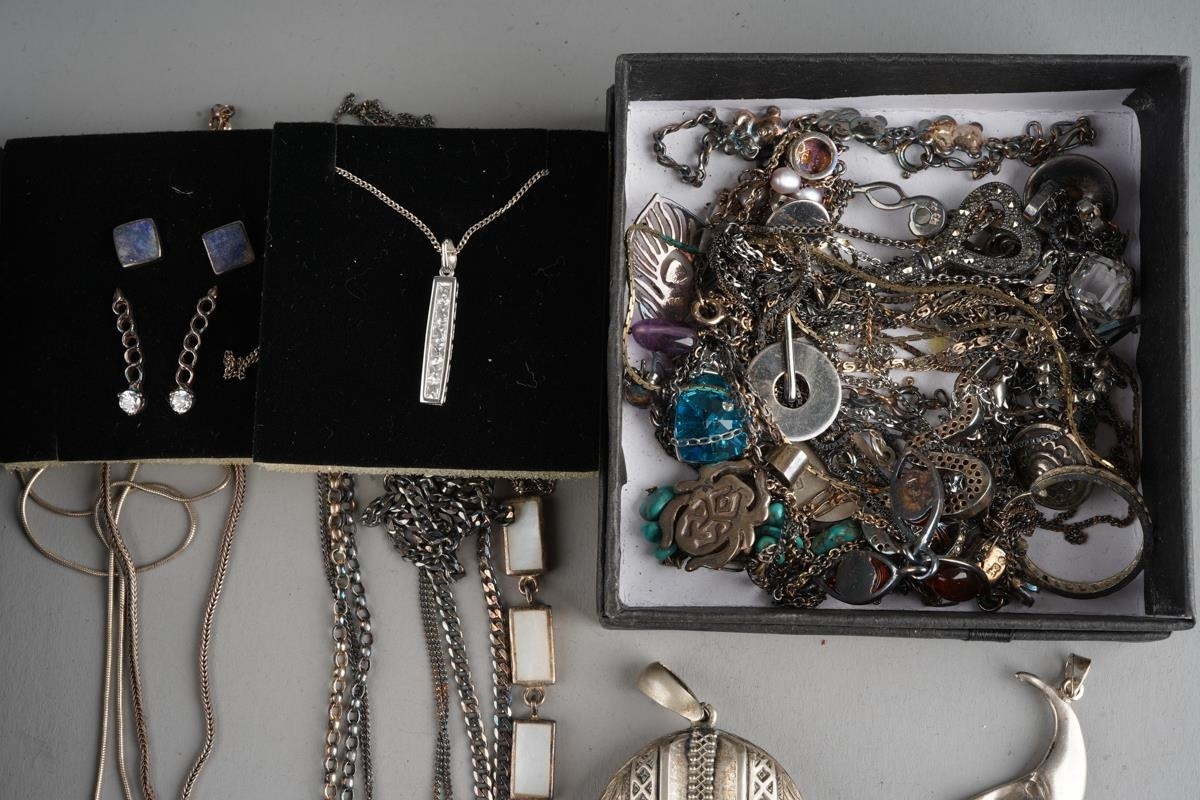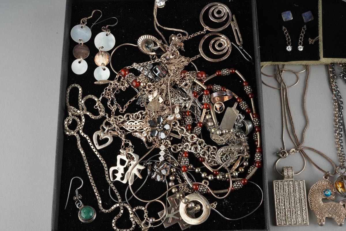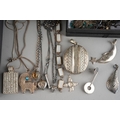 Assorted silver (925 and 800 standard) and white metal jewellery including necklaces, brooches, earrings, various designs, some diamante set (Q)