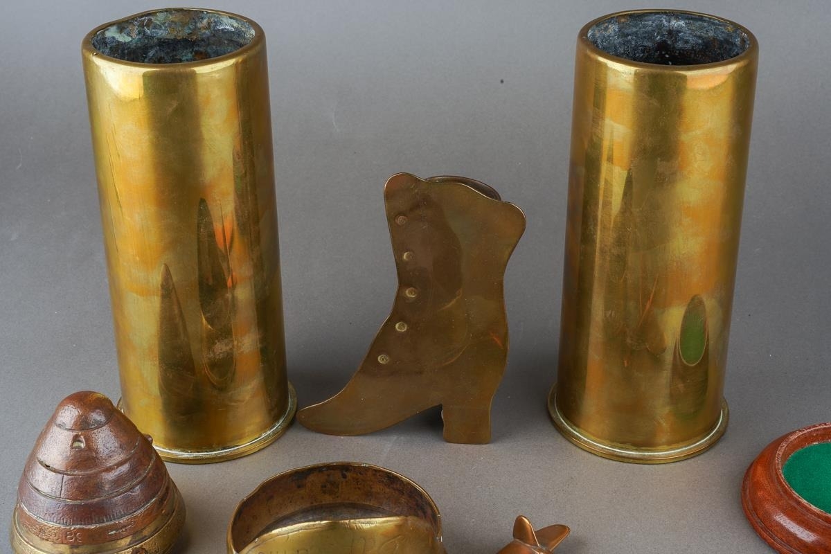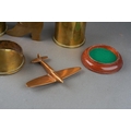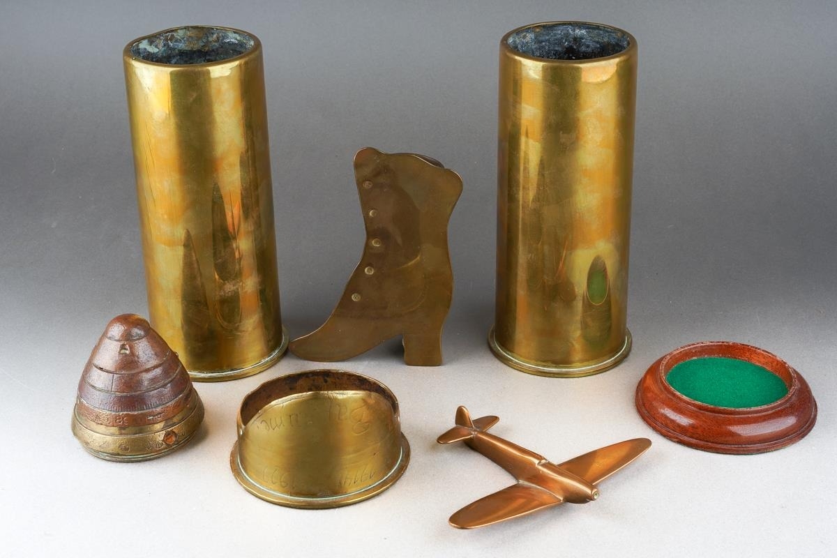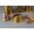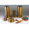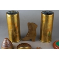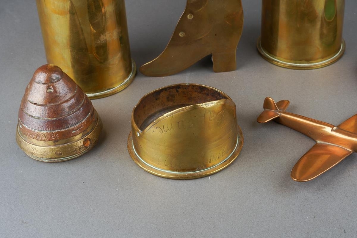 A small group of 20th century brass trench art, including a shell nose cone bearing a hand written label to the underside saying British 18lb Auchon Villiers Somme WWI France, a spill holder fashioned from a shell case with a boot to front, etc (6)