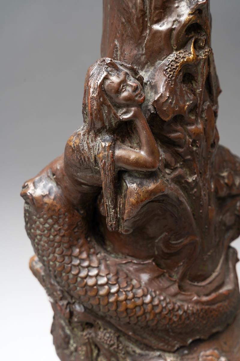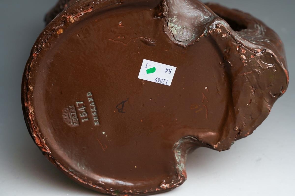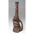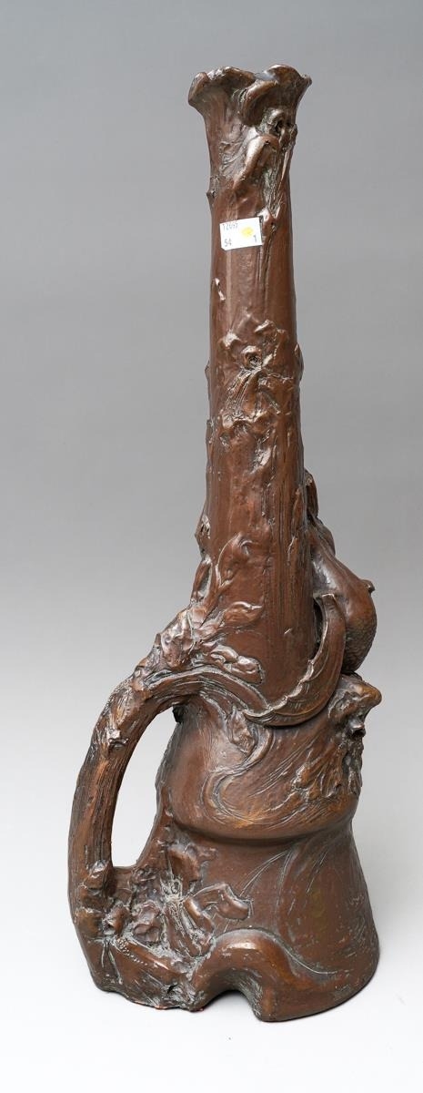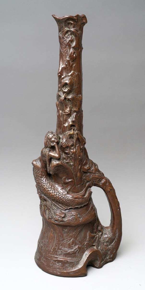 A large Bretby brown painted vase modelled with a mermaid and iris flowers, carrying handle., stamped and numbered 1547, 59cm high