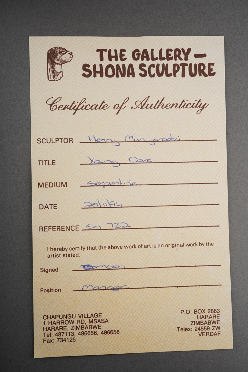 Henry Munyaradzi (Zimbabwean 1931-1998) Young Dove, an abstract serpentine sculpture, signed and numbered SN732 to base, height 23.5cm, comes with a certificate of authenticity bearing reference number Sn 732, a photograph and a short biography (2)