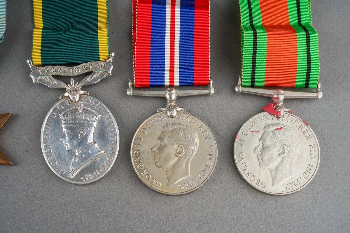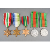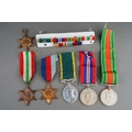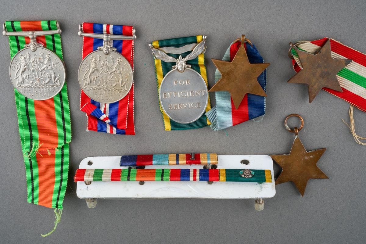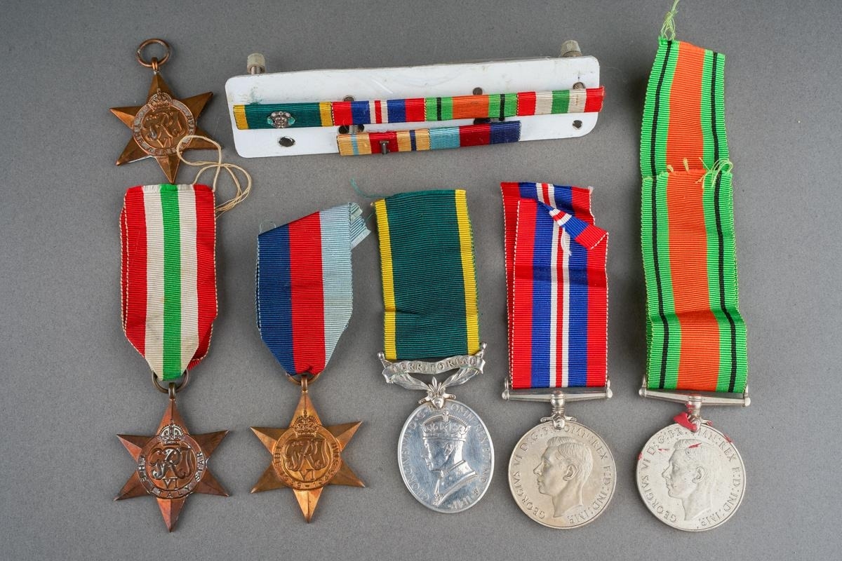 WW2 British Medal collection comprising of 1939-45 Star, Africa Star, Italy Star, War Medal, Defence Medal and a Territorial Efficiency Medal to 5112239 Cpl. GW Perry, Army Catering Corps. Along with a matching ribbon bar.