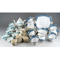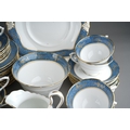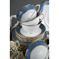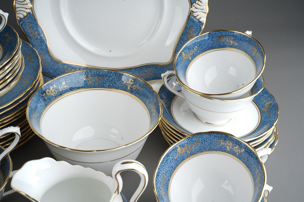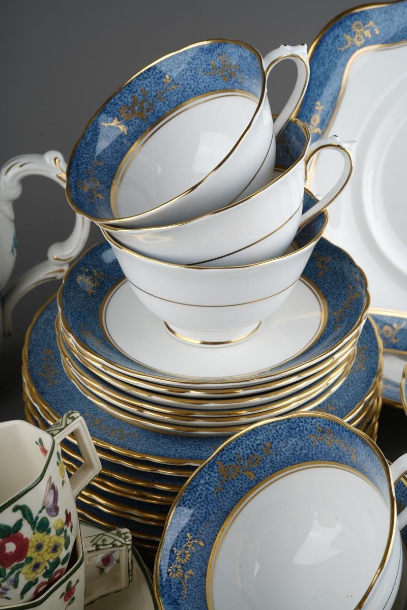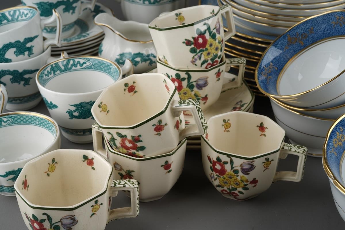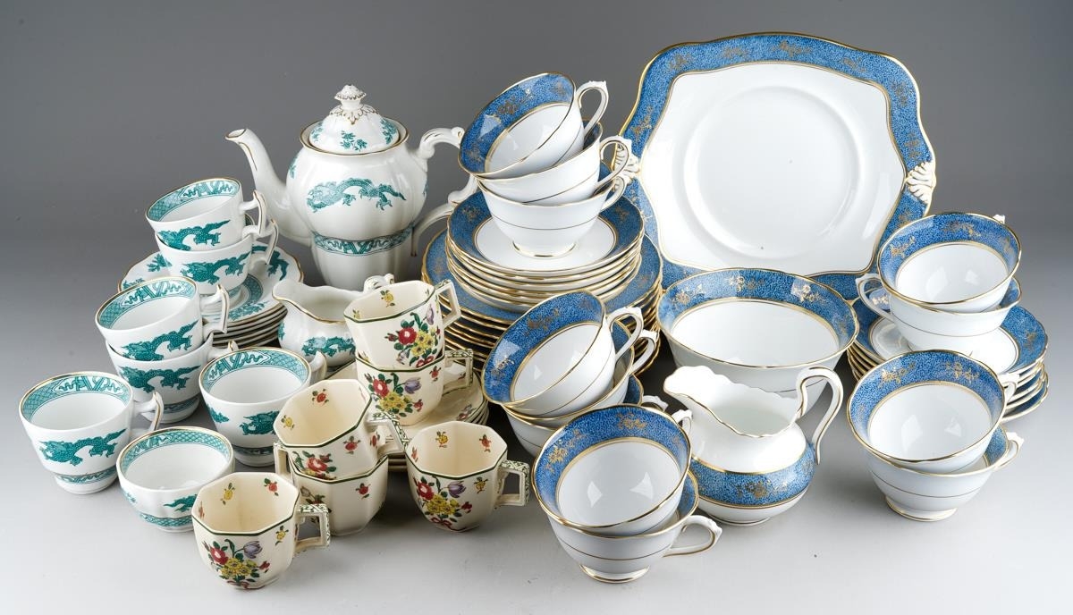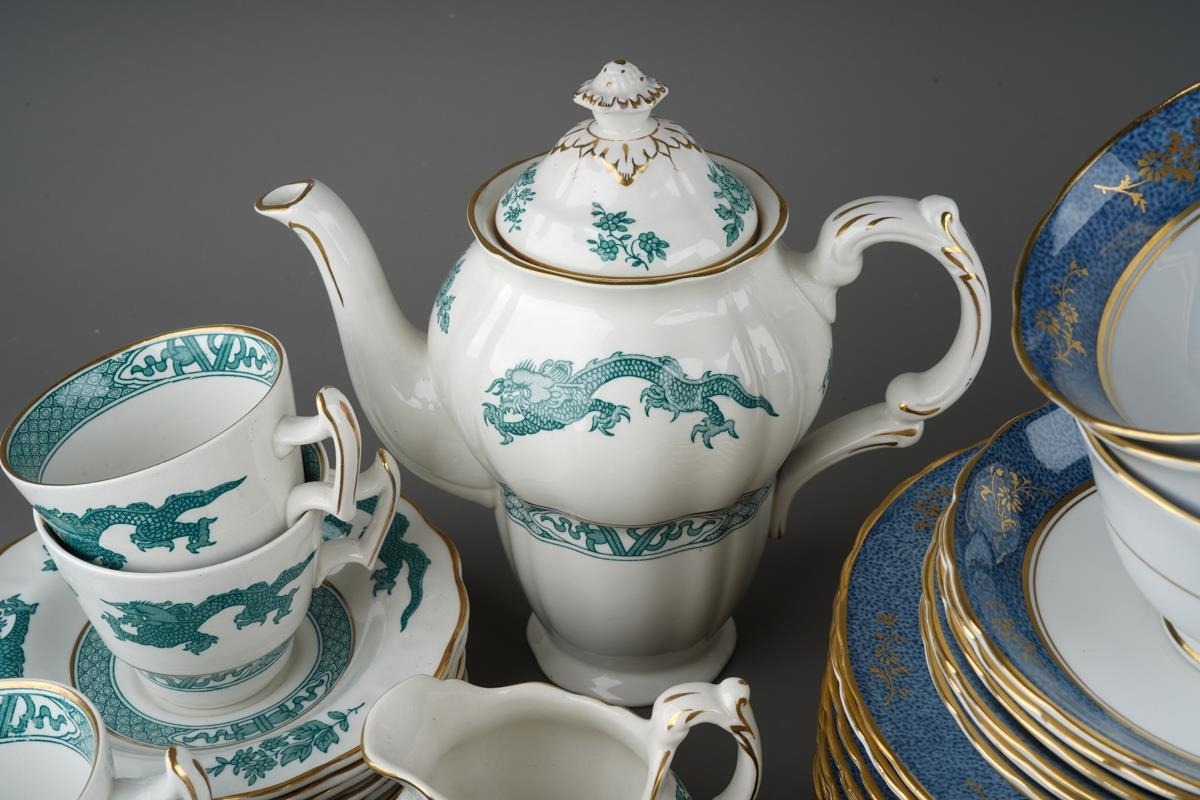 12 place setting Tuscan blue and gold tea set together with 6 Royal Doulton coffee cans and 5 saucers and Booths Dragon pattern coffee set for 6 with coffee pot ( 1 box)