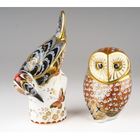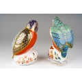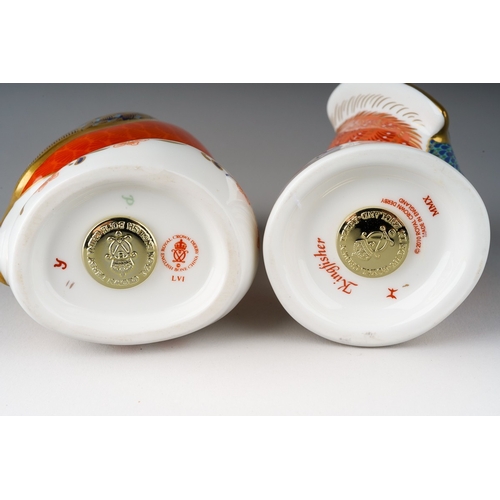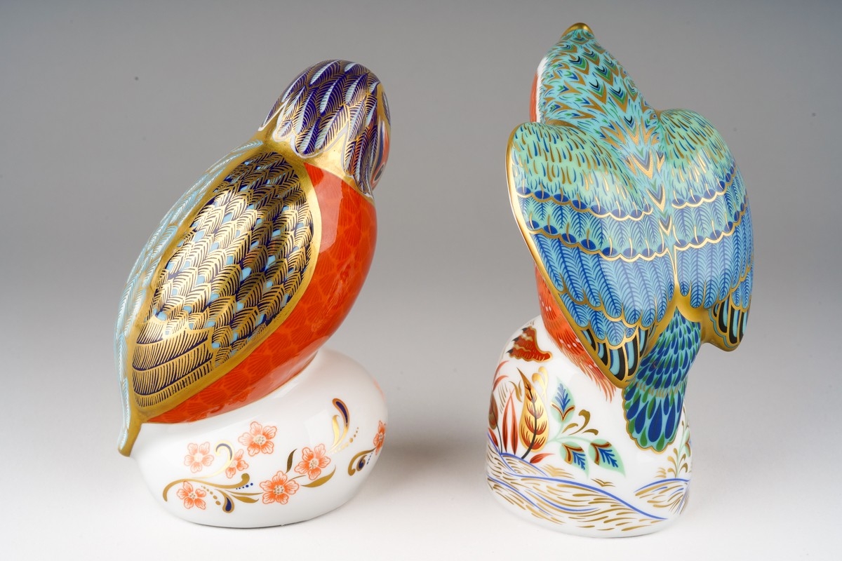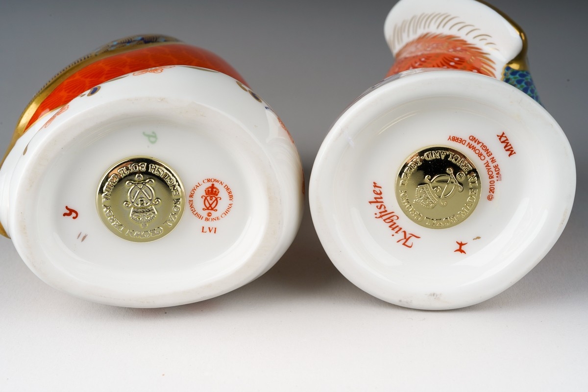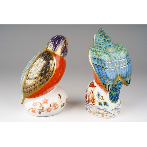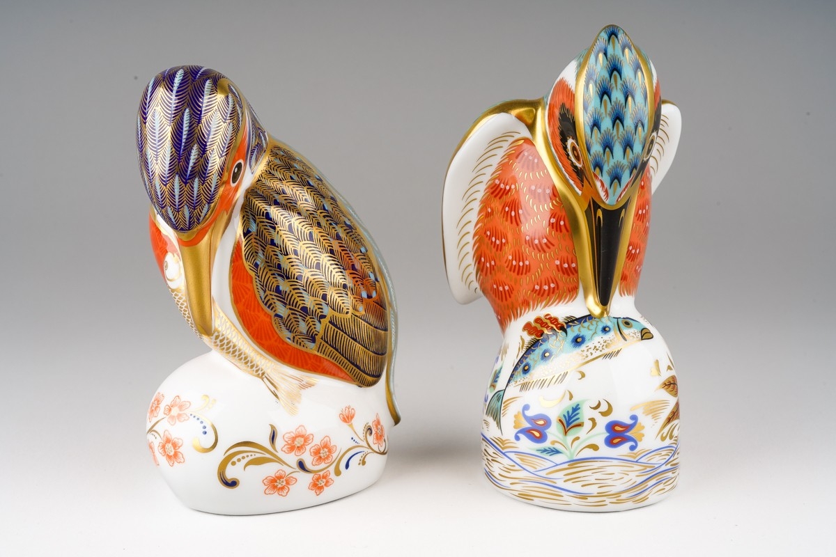 Two Royal Crown Derby Kingfisher paperweights, one being the Kedleston Kingfisher, both first quality, gold stoppers, no boxes or certificate, height 12cm and smaller, both in good condition (2)