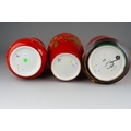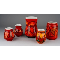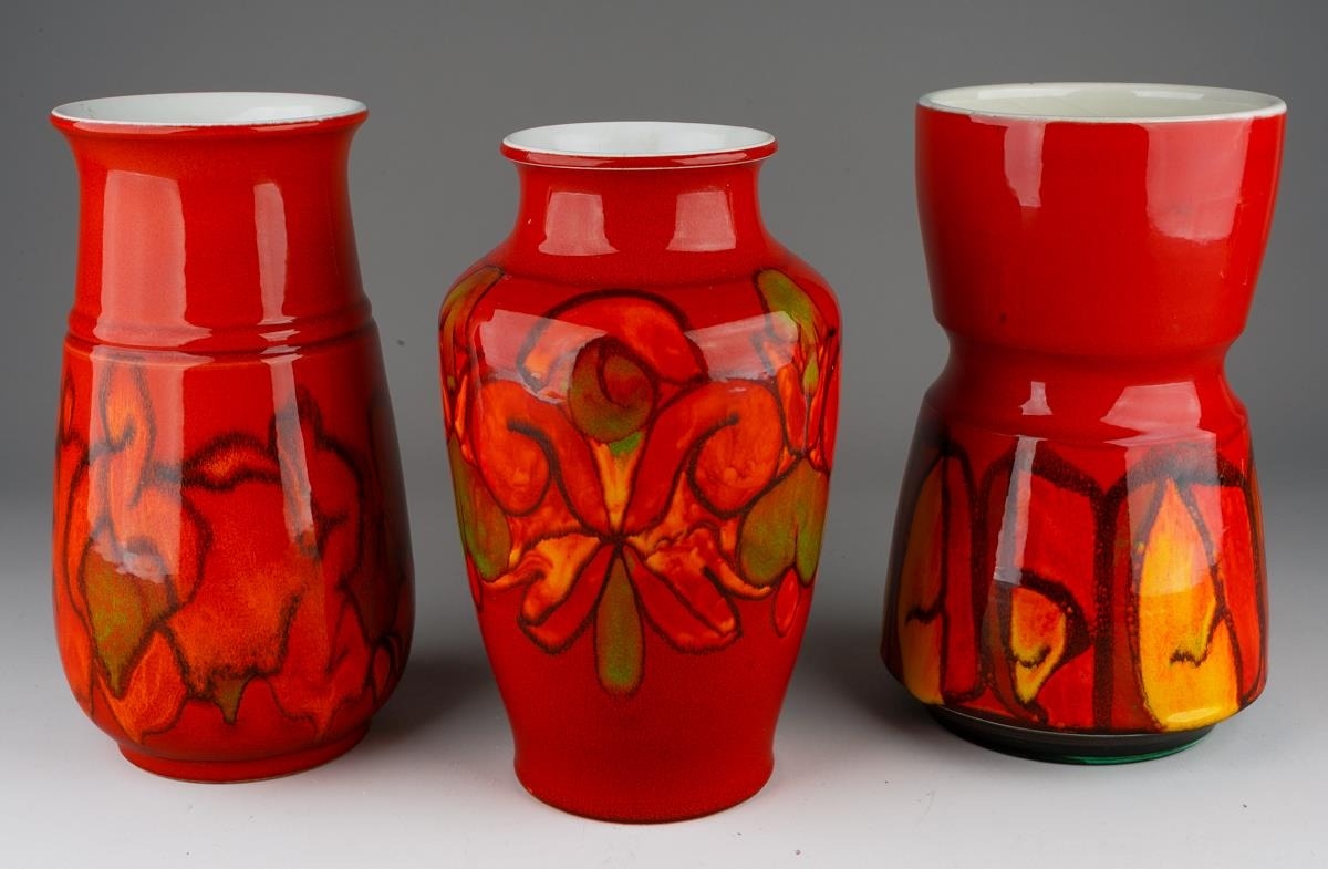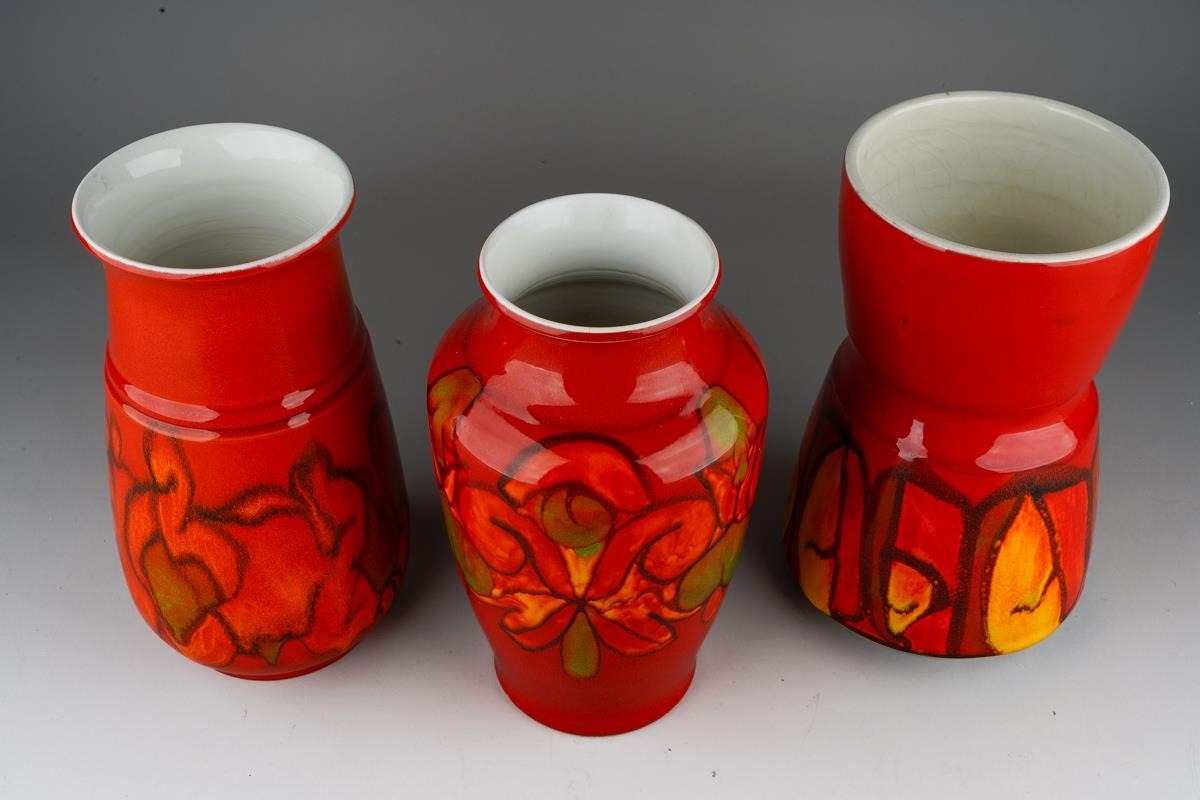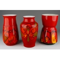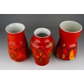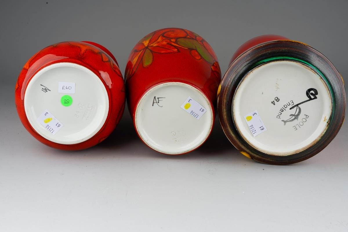 Three large Poole Pottery "Delphis" vases, all numbered 84, one with factory stamp and artist's initials, two with impressed marks and artist's initials, all 23cm tall [3]