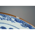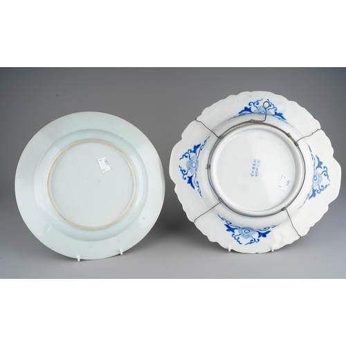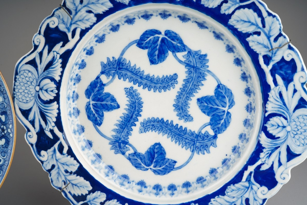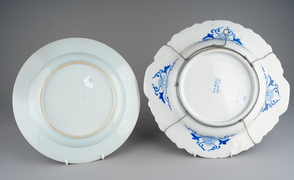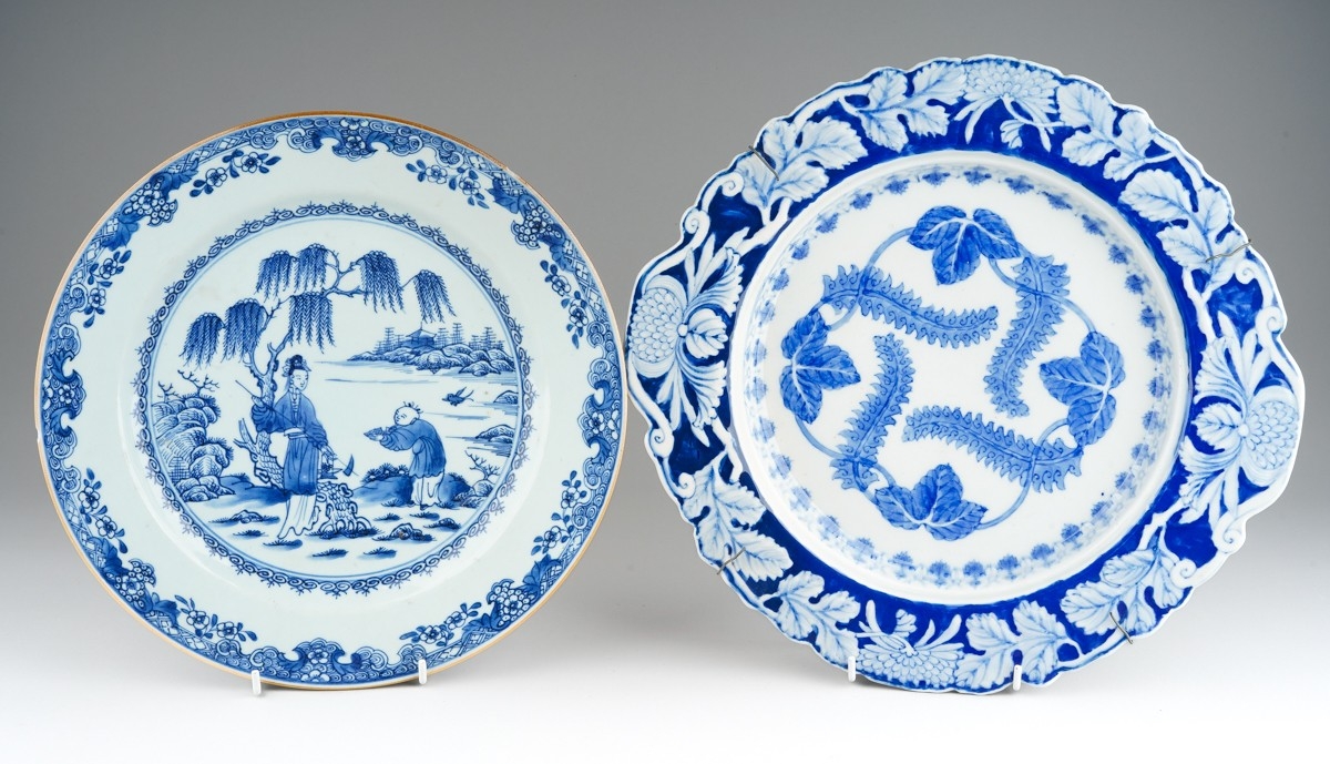 A Japanese moulded blue and white serving dish, Chrysanthemum and leaf moulding to border with fern leaves to centre, 10 Character marks to underside, approx 32cm wide together with a Chinese blue and white plate decorated with a Lady and attendant under willow tree, river landscape beyond, approx 27.5cm diam, chip to rim [2]