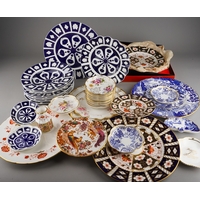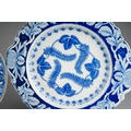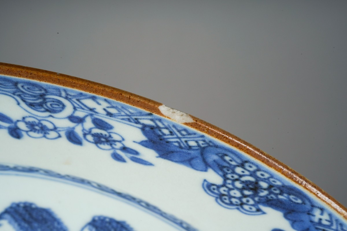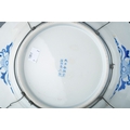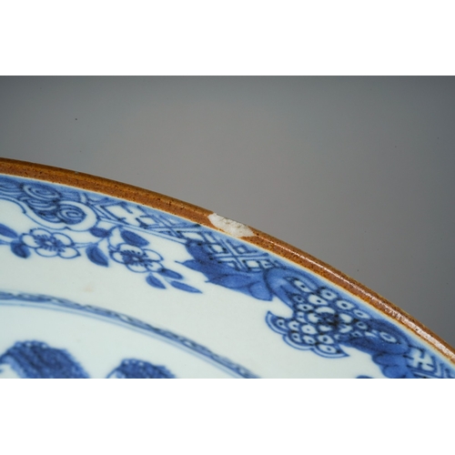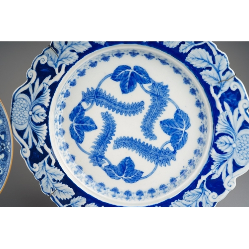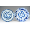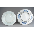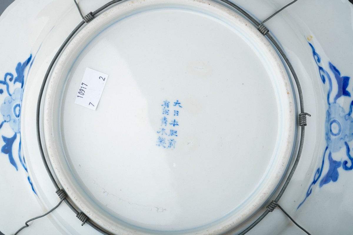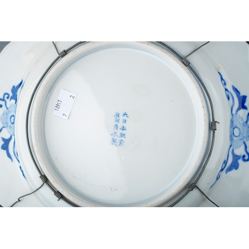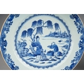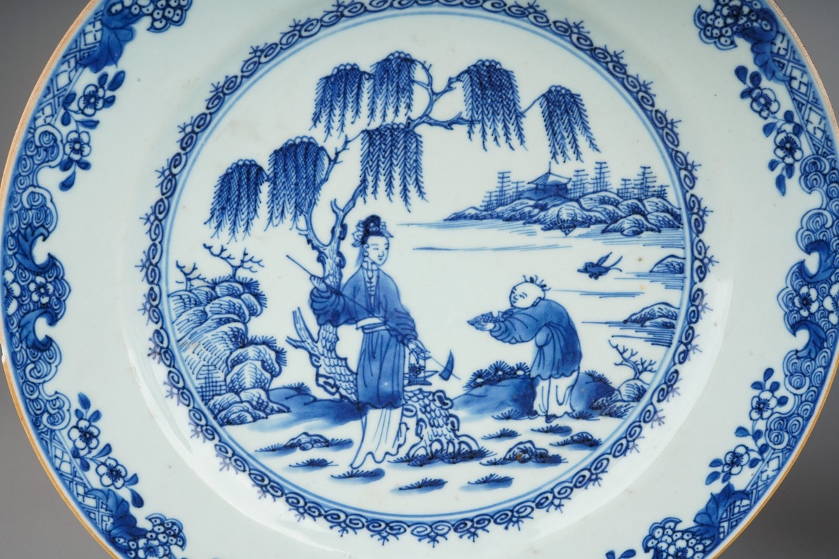 A Japanese moulded blue and white serving dish, Chrysanthemum and leaf moulding to border with fern leaves to centre, 10 Character marks to underside, approx 32cm wide together with a Chinese blue and white plate decorated with a Lady and attendant under willow tree, river landscape beyond, approx 27.5cm diam, chip to rim [2]