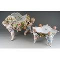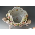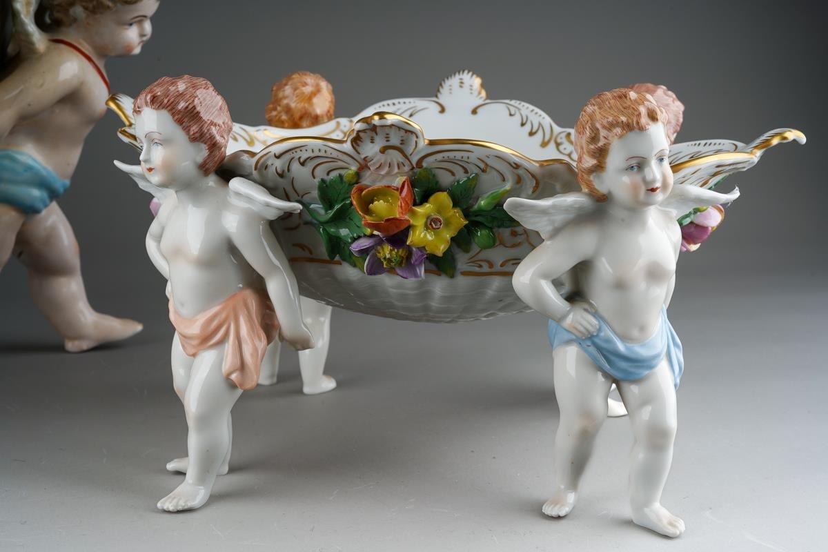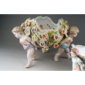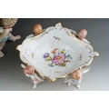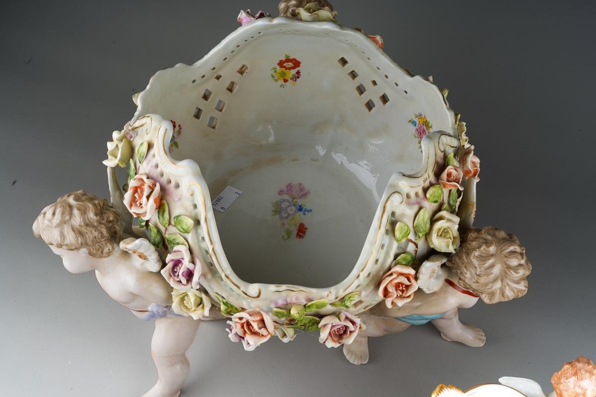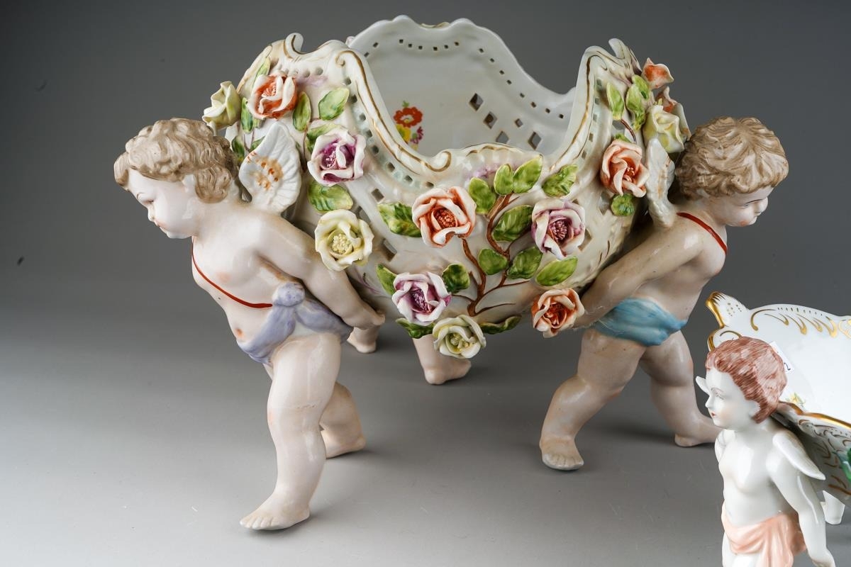 A German porcelain large fruit bowl, the shaped bowl with diamond lozenge piercing applied with roses and foliage in high relief, the interior painted with flowers, the entire held aloft by three winged putti, blue crossed swords mark to underside, approx 25cm high x 30cm wide and a Dresden Sitzendorf quatrefoil shaped centrepiece bowl., the centre painted with flowers gilt heightened, the exterior applied with flowers in high relief, basket weave section, the entire held aloft by four winged cherubs., impressed numbers., approx 26.5cm wide x 14.5cm high [2]