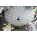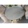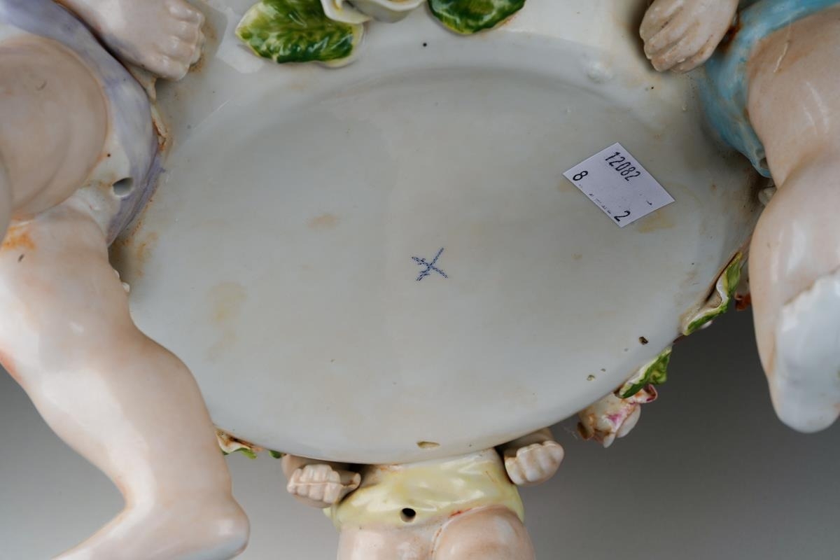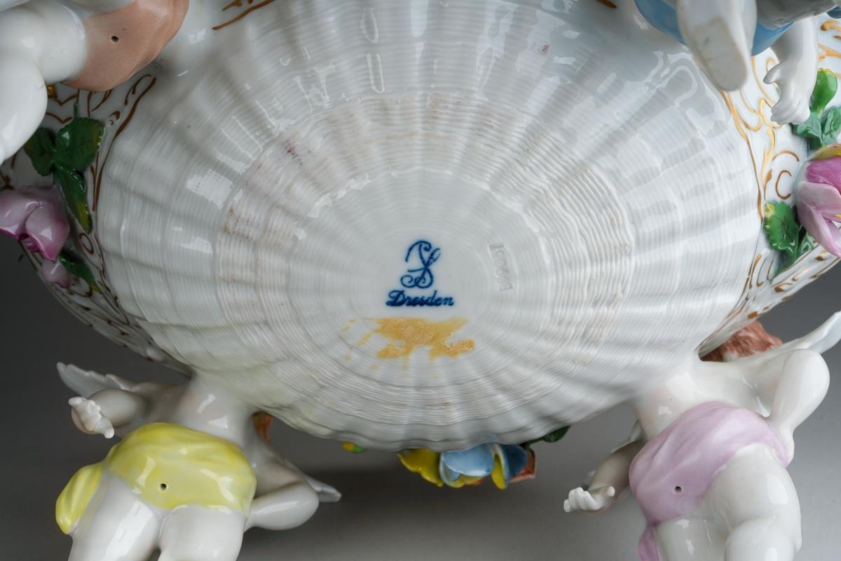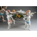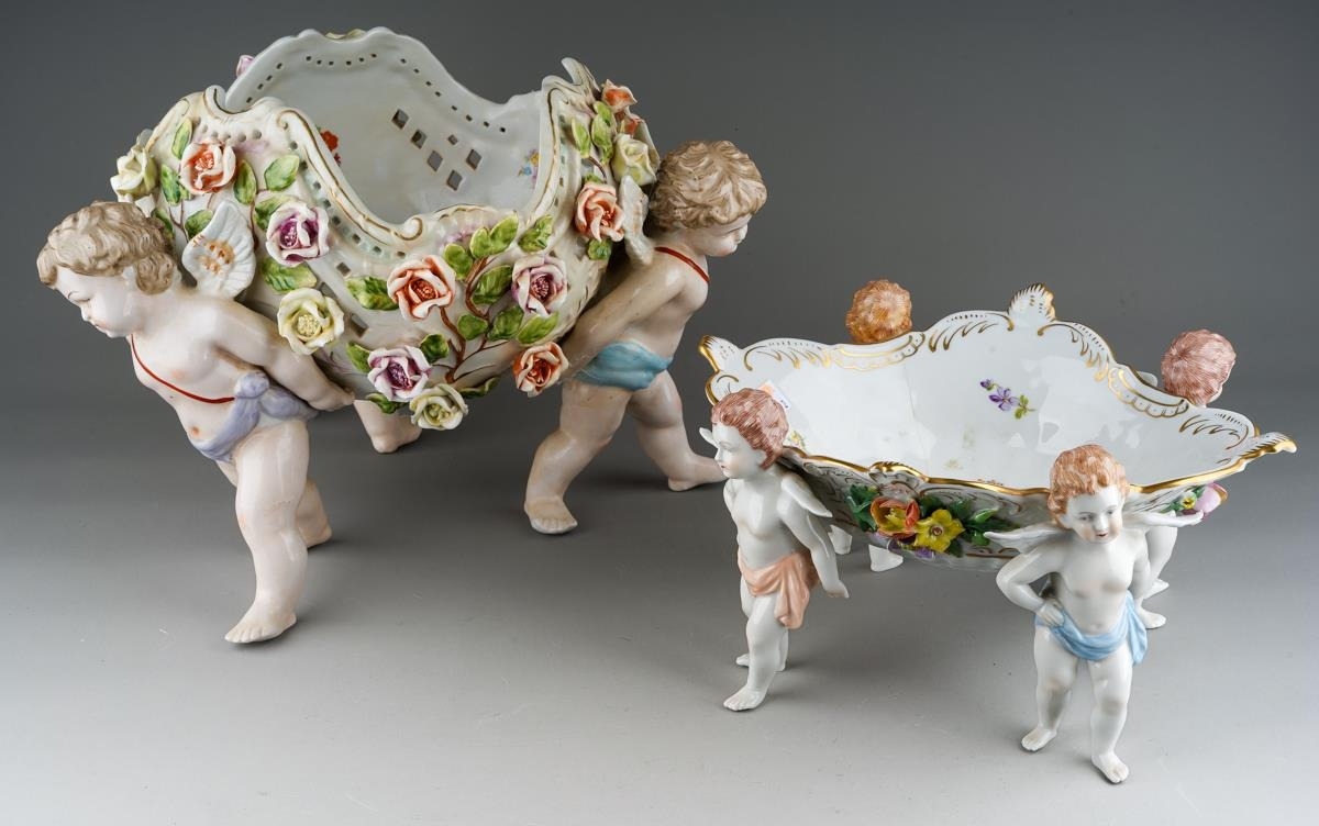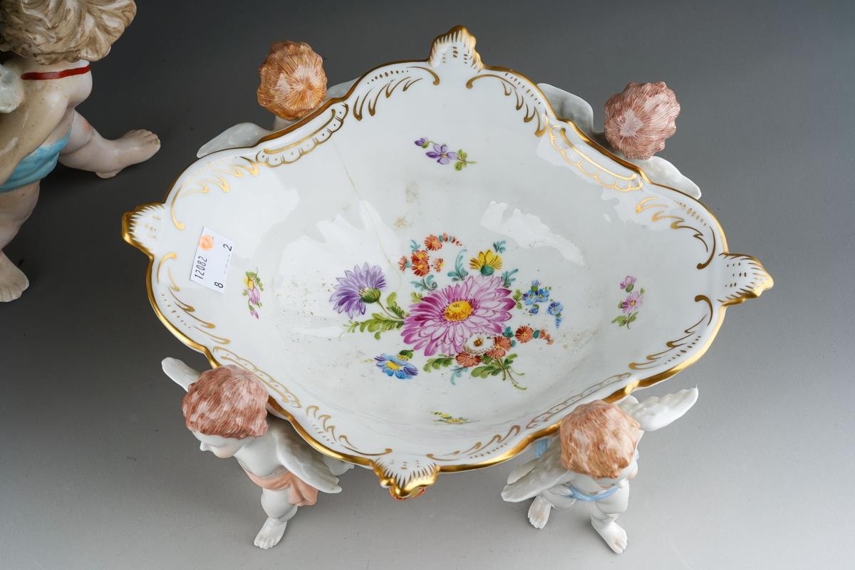 A German porcelain large fruit bowl, the shaped bowl with diamond lozenge piercing applied with roses and foliage in high relief, the interior painted with flowers, the entire held aloft by three winged putti, blue crossed swords mark to underside, approx 25cm high x 30cm wide and a Dresden Sitzendorf quatrefoil shaped centrepiece bowl., the centre painted with flowers gilt heightened, the exterior applied with flowers in high relief, basket weave section, the entire held aloft by four winged cherubs., impressed numbers., approx 26.5cm wide x 14.5cm high [2]