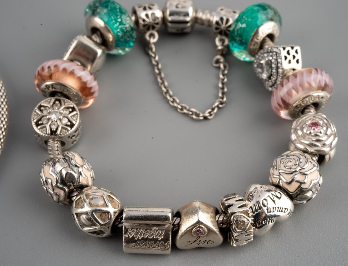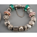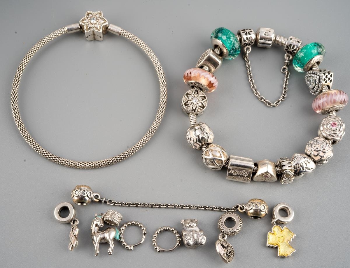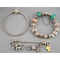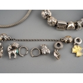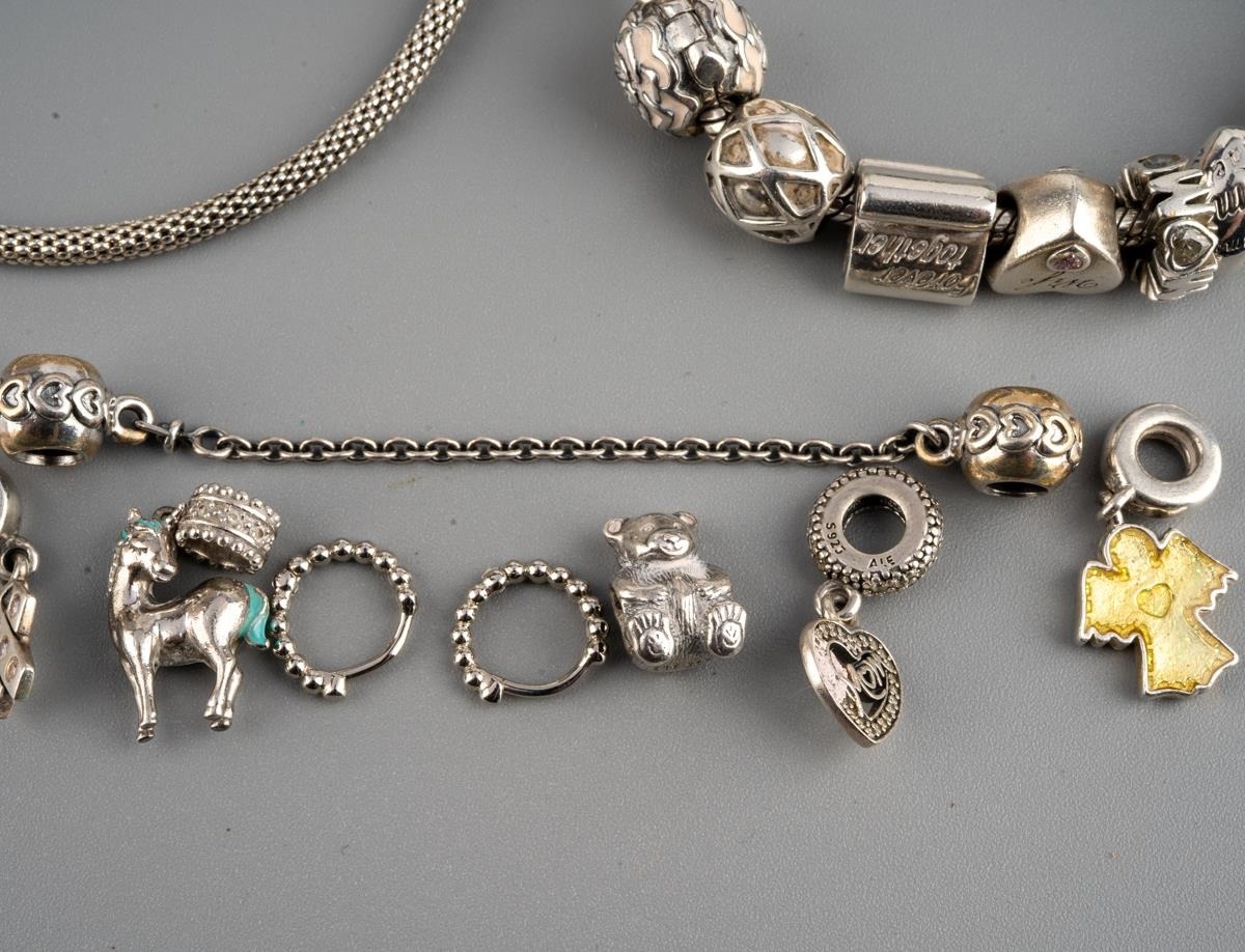 Two Pandora bracelets and further items. One bracelet with 'shine bright' star, the second bracelet with approx fifteen charms and one chain connector, together with five loose charms, one non designer unmakred cham and pair of ear hoops, both bracelets and pandora charms stamped 925 ALE, approx length of bracelets 195mm and 200mm, gross weight 77.73 grams.
