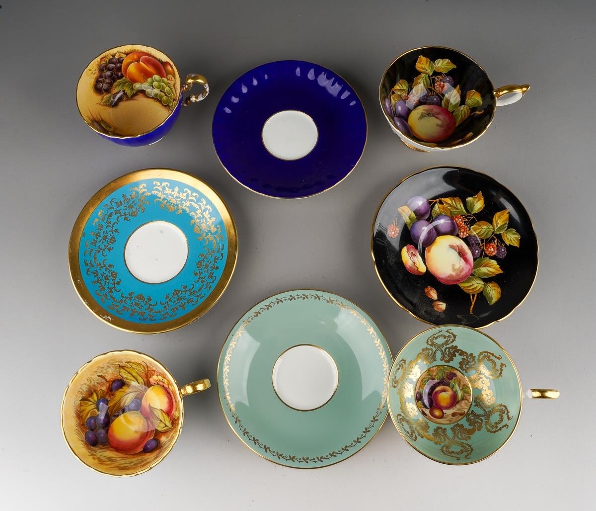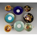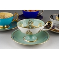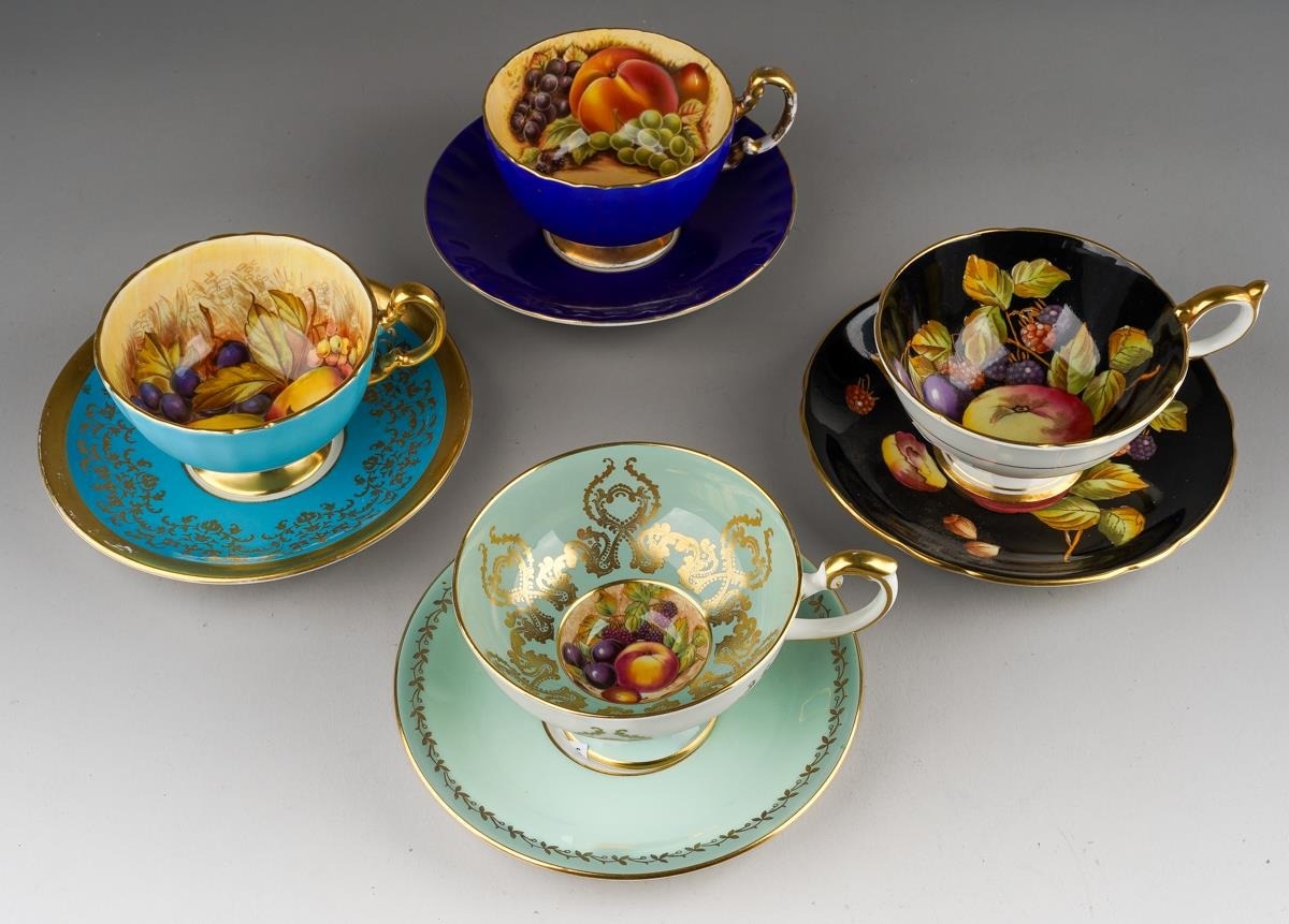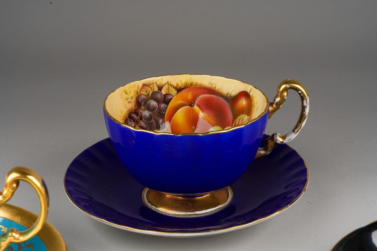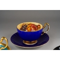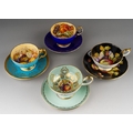 Four Aynsley cups and saucers to include: pattern no 2832, gilt scrolls on turquoise ground with Autumn fruits to centre of cup; # C1174 Autumn fruits painted on black ground with gilt borders; pattern 1034 the cup painted with Autumn fruits on blue ground, the saucer with gilt foliage and border and cobalt blue ground painted with Autumn fruits to centre of cup, plain scalloped saucer [4]