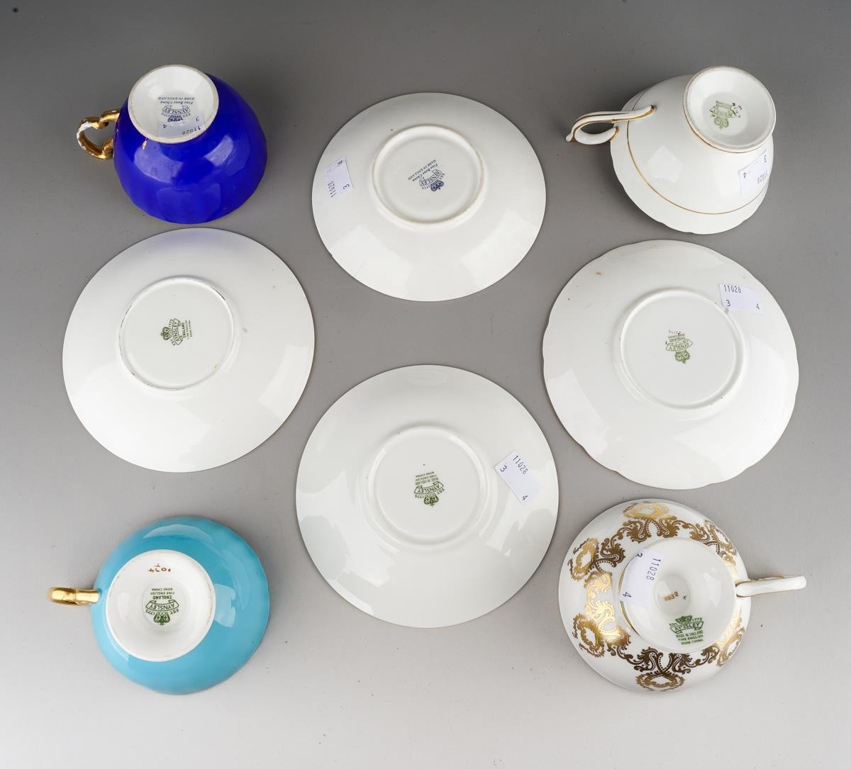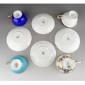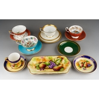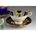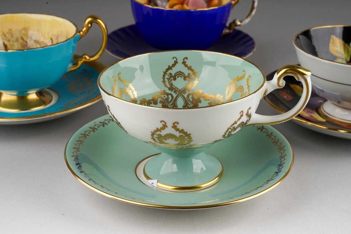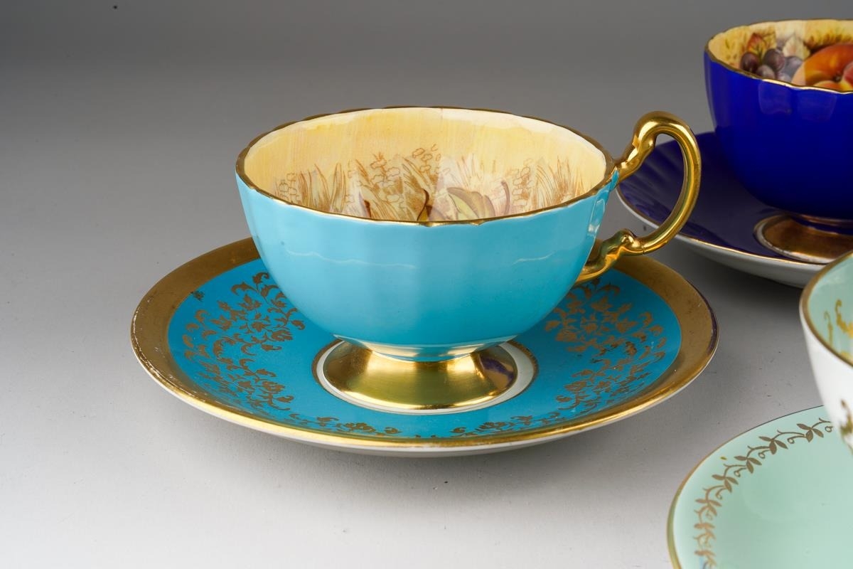 Four Aynsley cups and saucers to include: pattern no 2832, gilt scrolls on turquoise ground with Autumn fruits to centre of cup; # C1174 Autumn fruits painted on black ground with gilt borders; pattern 1034 the cup painted with Autumn fruits on blue ground, the saucer with gilt foliage and border and cobalt blue ground painted with Autumn fruits to centre of cup, plain scalloped saucer [4]