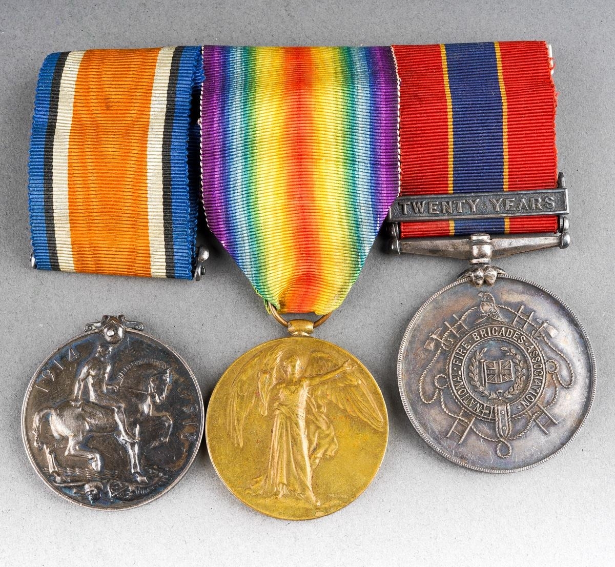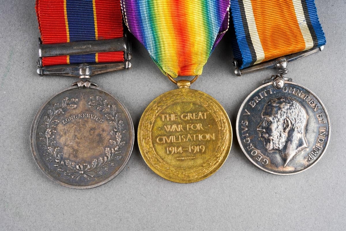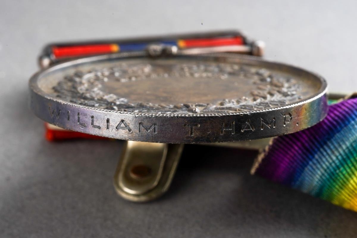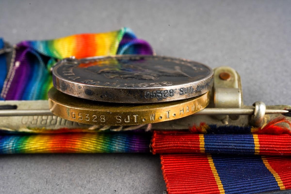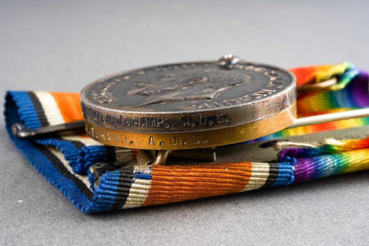 A set of three WW1 medals, 05328 SJT.W.T. Hamp A.O.C on two 3725 William T. Hamp on the 3rd